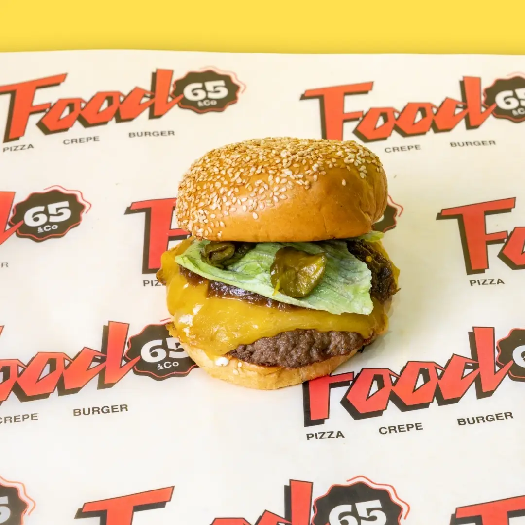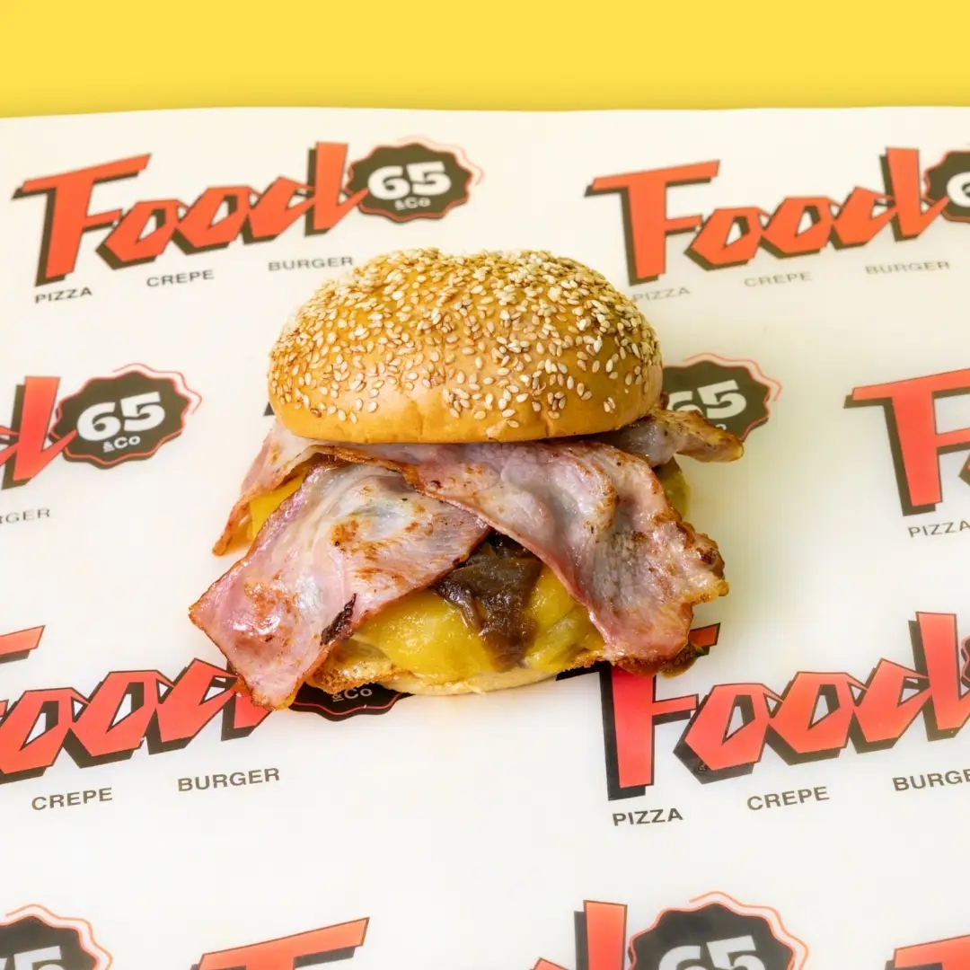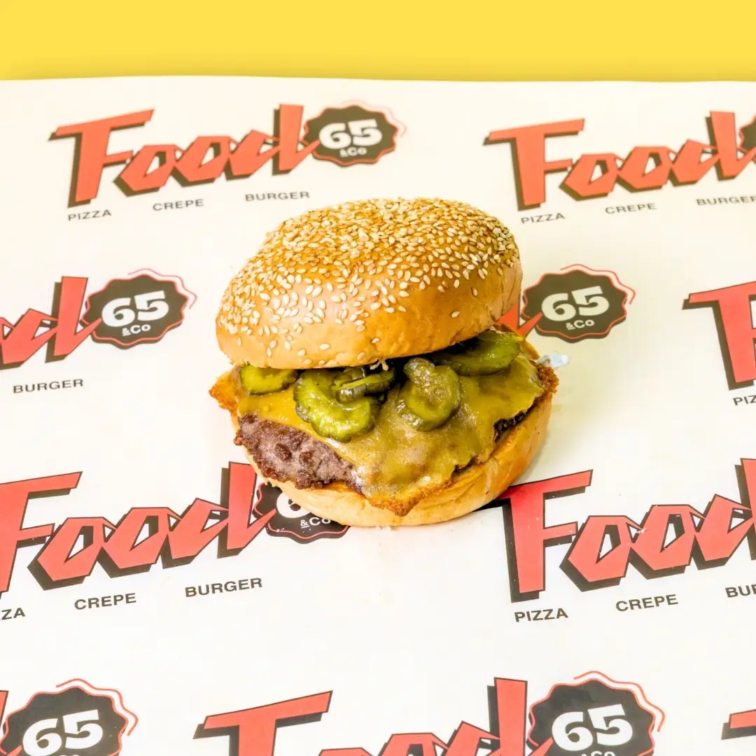 Burger patty, mustard mayo, gherkins, tomato, iceberg, red onion