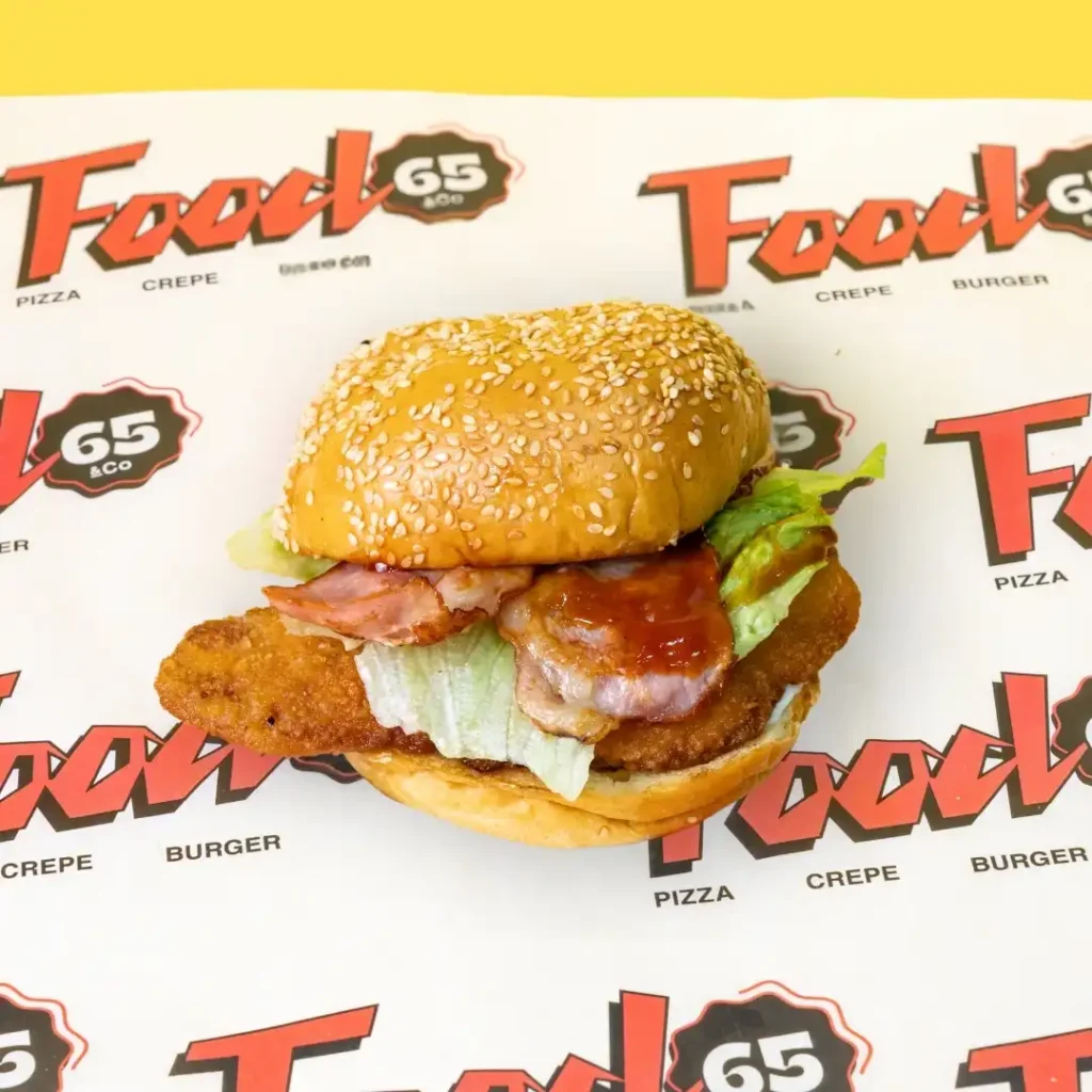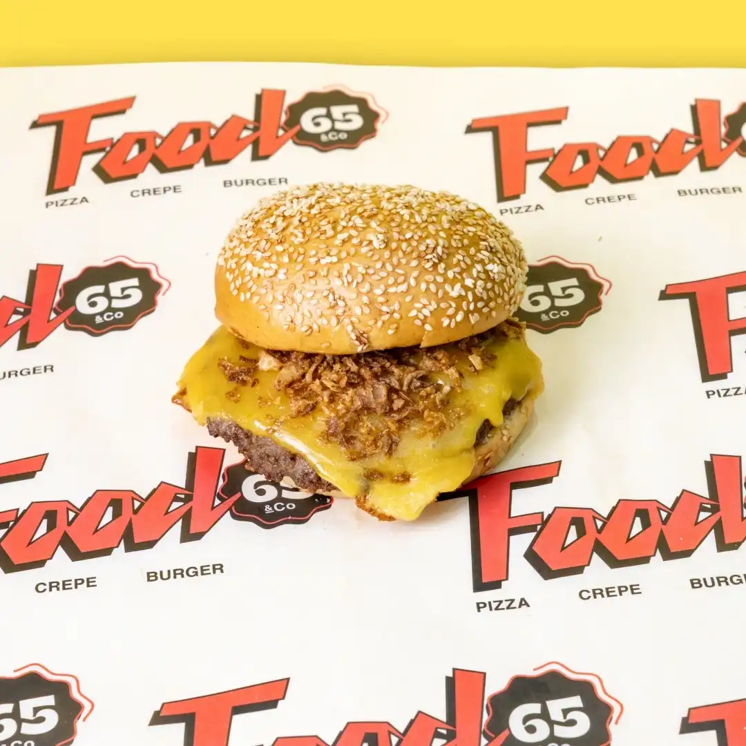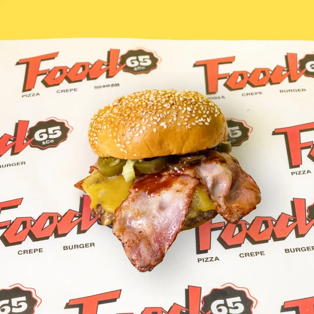 Burger patty, mustard mayo, gherkins, tomato, iceberg, red onion