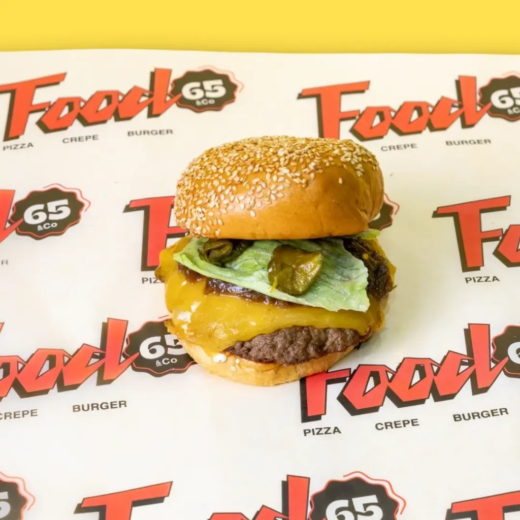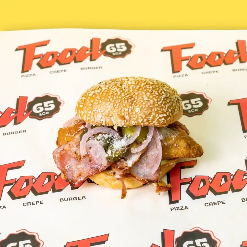 Μοσχαρίσιο μπιφτέκι, μαγιονέζα μουστάρδας αγγουράκι τουρσί, τομάτα, άισμπεργκ, κόκκινο κρεμμύδι.
